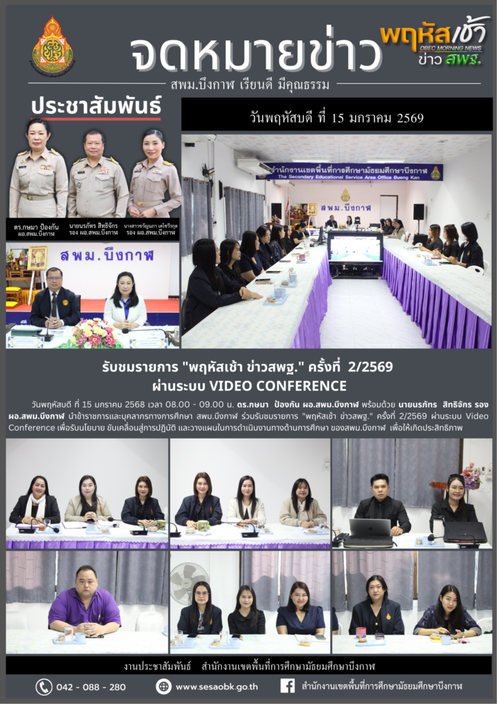 จดหมายข่าว สพม.บึงกาฬร่วมรับชมรายการ “พฤหัสเช้า ข่าวสพฐ.” ครั้งที่ 2/2569 ผ่านระบบ Video Conference Leave a Comment / จดหมายข่าว สพม.บึงกาฬ / นางสาววริศรา ธรรมลี