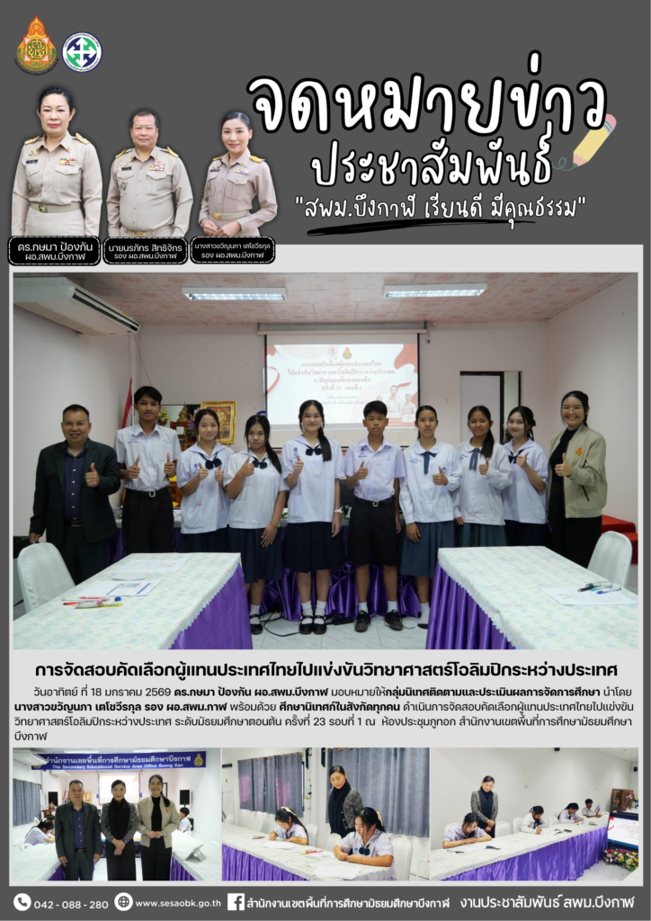 จดหมายข่าว สพม.บึงกาฬการจัดสอบคัดเลือกผู้แทนประเทศไทยไปแข่งขันวิทยาศาสตร์โอลิมปิกระหว่างประเทศ ระดับมัธยมศึกษาตอนต้น ครั้งที่ 23 รอบที่ 1 Leave a Comment / จดหมายข่าว สพม.บึงกาฬ / นางสาววริศรา ธรรมลี