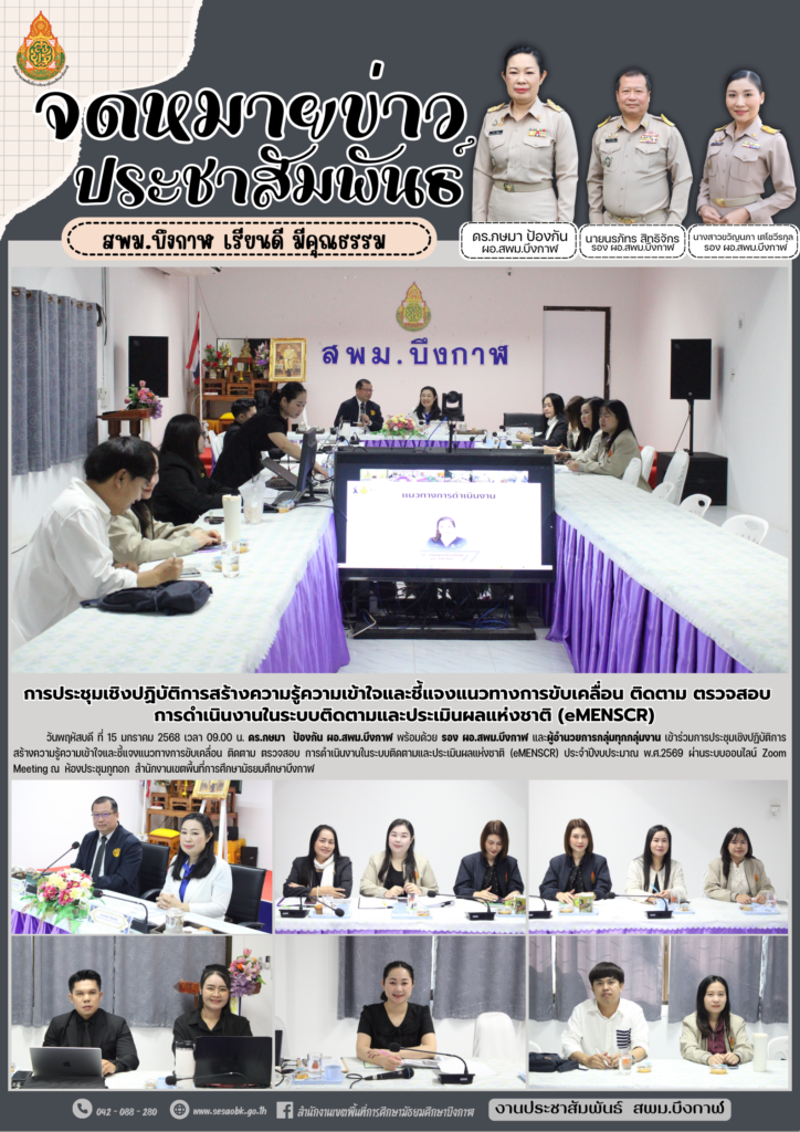 จดหมายข่าว สพม.บึงกาฬการประชุมเชิงปฏิบัติการสร้างความรู้ความเข้าใจและชี้แจงแนวทางการขับเคลื่อน ติดตาม ตรวจสอบ การดำเนินงานในระบบติดตามและประเมินผลแห่งชาติ (eMENSCR) ประจำปีงบประมาณ พ.ศ.2569 Leave a Comment / จดหมายข่าว สพม.บึงกาฬ / นางสาววริศรา ธรรมลี