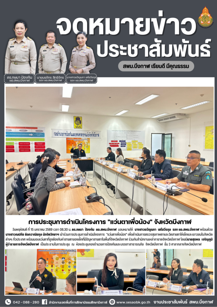 จดหมายข่าว สพม.บึงกาฬการประชุมการดำเนินโครงการ “แว่นตาเพื่อน้อง” เพื่อดำเนินการตรวจสุขภาพตาและวัดสายตาให้เด็กและเยาวชน Leave a Comment / จดหมายข่าว สพม.บึงกาฬ / นางสาววริศรา ธรรมลี