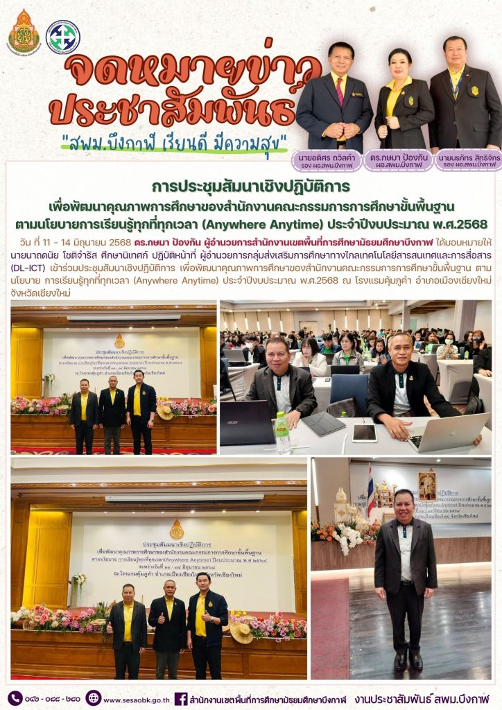 จดหมายข่าว สพม.บึงกาฬการประชุมสัมนาเชิงปฏิบัติการ เพื่อพัฒนาคุณภาพการศึกษาของสำนักงานคณะกรรมการการศึกษาขั้นพื้นฐาน ตามนโยบายการเรียนรู้ทุกที่ทุกเวลา (Anywhere Anytime) ประจำปีงบประมาณ พ.ศ.2568 Leave a Comment / จดหมายข่าว สพม.บึงกาฬ / นางสาววริศรา ธรรมลี