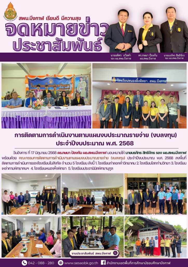 จดหมายข่าว สพม.บึงกาฬการติดตามการดำเนินงานตามแผนงบประมาณรายจ่าย (งบลงทุน) ประจำปีงบประมาณ พ.ศ. 2568 Leave a Comment / จดหมายข่าว สพม.บึงกาฬ / นางสาววริศรา ธรรมลี ประจำปีงบประมาณ พ.ศ.