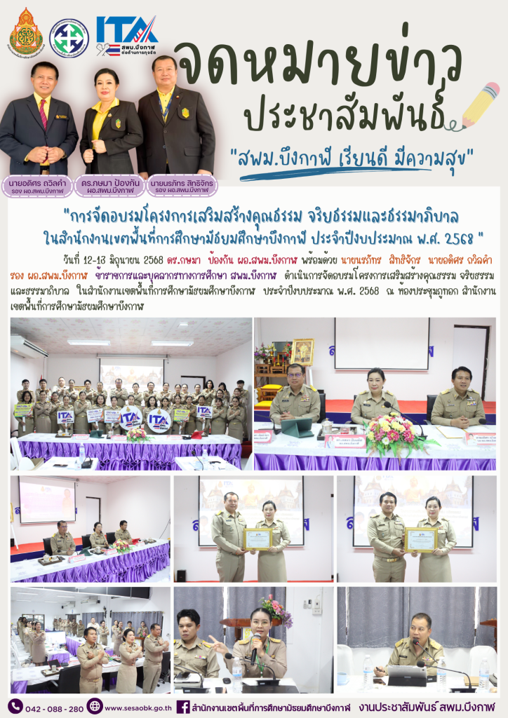 จดหมายข่าว สพม.บึงกาฬ“การจัดอบรมโครงการเสริมสร้างคุณธรรม จริยธรรมและธรรมาภิบาล ในสำนักงานเขตพื้นที่การศึกษามัธยมศึกษาบึงกาฬ ประจำปีงบประมาณ พ.ศ. 2568 “ Leave a Comment / จดหมายข่าว สพม.บึงกาฬ / นางสาววริศรา ธรรมลี