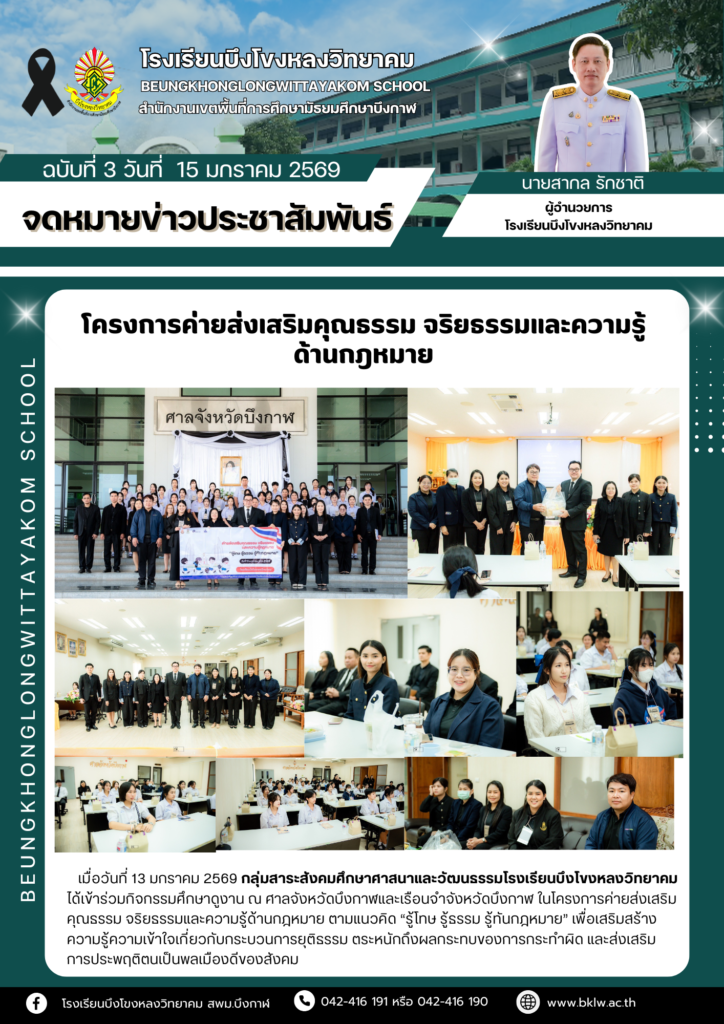 จดหมายข่าวโรงเรียนโครงการค่ายส่งเสริมคุณธรรม จริยธรรมและความรู้ด้านกฎหมาย Leave a Comment / จดหมายข่าวโรงเรียน / Piyawadee
