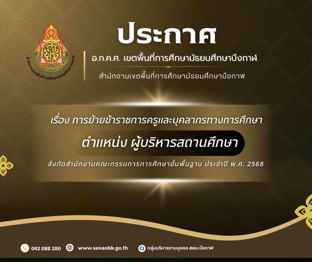 งานบุคคล, ประชาสัมพันธ์สำนักงานเขตพื้นที่การศึกษามัธยมศึกษาบึงกาฬ ประชาสัมพันธ์การย้ายราชการครูและบุคลากรทางการศึกษา ตำแหน่งผู้บริหารสถานศึกษา สังกัดสำนักงานคณะกรรมการการศึกษาขั้นพื้นฐาน ประจำปี พ.ศ.2568 Leave a Comment / งานบุคคล, ประชาสัมพันธ์ / ดวงดี โคตะ สำนักงานเขตพื้นที่กา