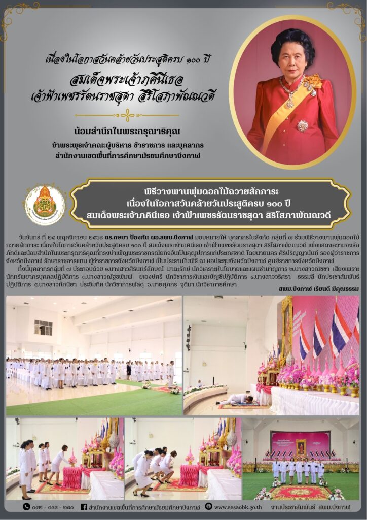 จดหมายข่าว สพม.บึงกาฬพิธีวางพานพุ่มดอกไม้ถวายสักการะ เนื่องในโอกาสวันคล้ายวันประสูติครบ ๑๐๐ ปี สมเด็จพระเจ้าภคินีเธอ เจ้าฟ้าเพชรรัตนราชสุดา สิริโสภาพัณณวดี Leave a Comment / จดหมายข่าว สพม.บึงกาฬ / นางสาววริศรา ธรรมลี