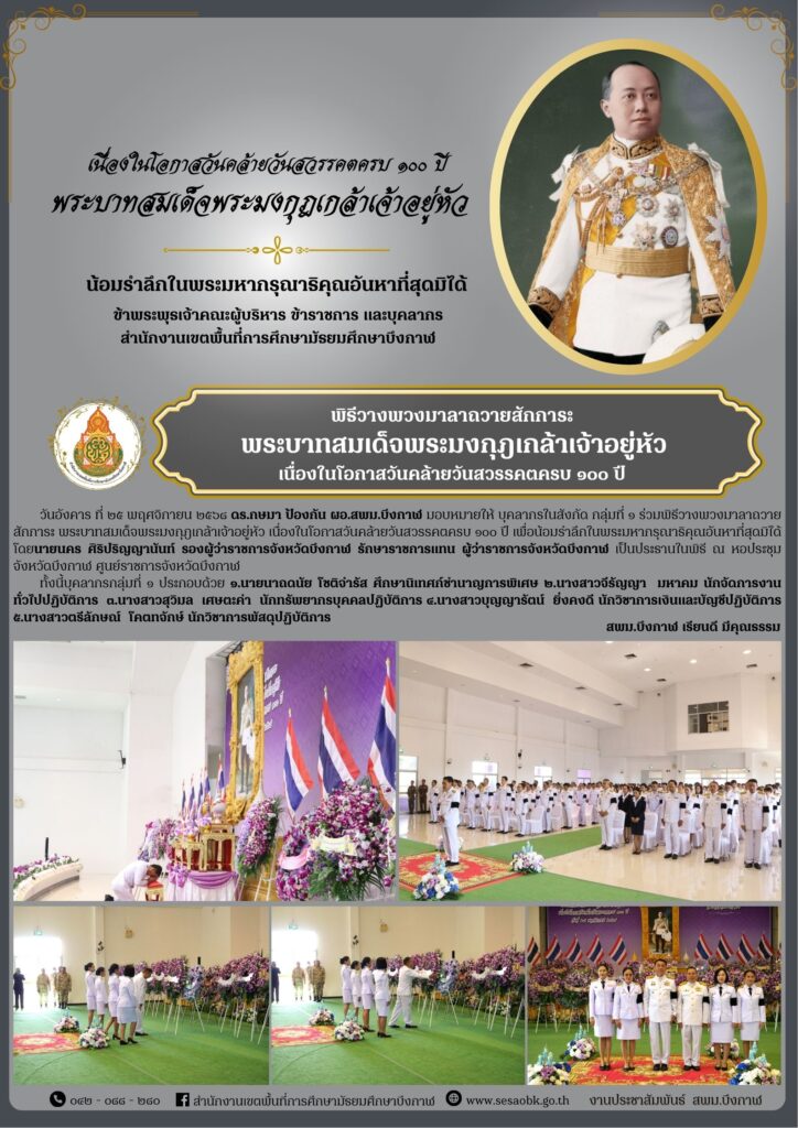 จดหมายข่าว สพม.บึงกาฬพิธีวางพวงมาลาถวายสักการะ พระบาทสมเด็จพระมงกุฎเกล้าเจ้าอยู่หัว เนื่องในโอกาสวันคล้ายวันสวรรคตครบ ๑๐๐ ปี เพื่อน้อมรำลึกในพระมหากรุณาธิคุณอันหาที่สุดมิได้ Leave a Comment / จดหมายข่าว สพม.บึงกาฬ / นางสาววริศรา ธรรมลี