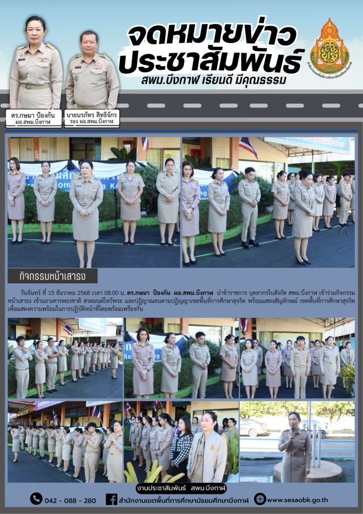 จดหมายข่าว สพม.บึงกาฬกิจกรรมหน้าเสาธง เข้าแถวเคารพธงชาติ สวดมนต์ไหว้พระ และปฏิญาณตนตามปฏิญญาเขตพื้นที่การศึกษาสุจริต Leave a Comment / จดหมายข่าว สพม.บึงกาฬ / นางสาววริศรา ธรรมลี