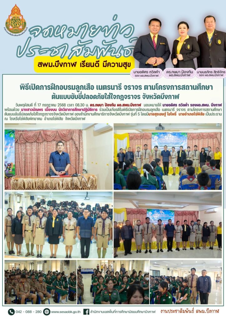 พิธีเปิดการฝึกอบรมลูกเสือ เนตรนารี จราจร ตามโครงการสถานศึกษาต้นแบบขับขี่ปลอดภัยใส่ใจกฎจราจรจังหวัดบึงกาฬ ของสำนักงานศึกษาธิการจังหวัดบึงกาฬ รุ่นที่ 5By นางสาววริศรา ธรรมลี / 17 กรกฎาคม 2025