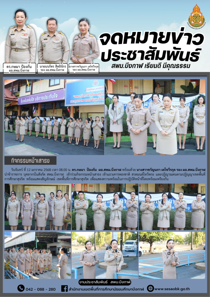 กิจกรรมหน้าเสาธง เข้าแถวเคารพธงชาติ สวดมนต์ไหว้พระ และปฏิญาณตนตามปฏิญญาเขตพื้นที่การศึกษาสุจริตBy นางสาววริศรา ธรรมลี / 12 มกราคม 2026