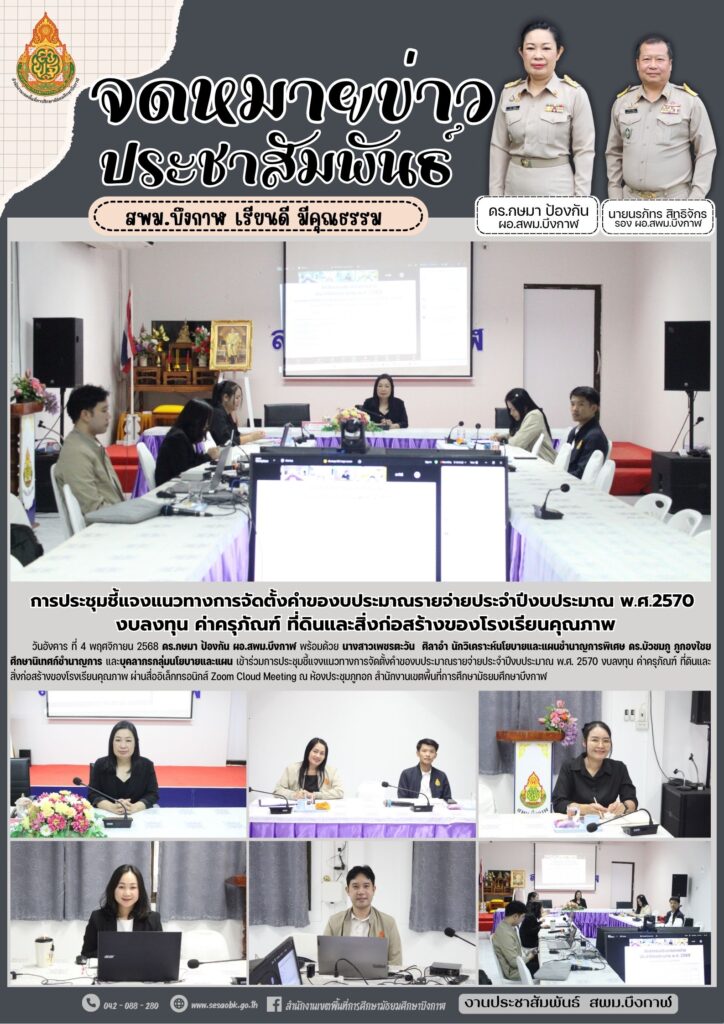 จดหมายข่าว สพม.บึงกาฬการประชุมชี้แจงแนวทางการจัดตั้งคำของบประมาณรายจ่ายประจำปีงบประมาณ พ.ศ.2570 งบลงทุน ค่าครุภัณฑ์ ที่ดินและสิ่งก่อสร้างของโรงเรียนคุณภาพ Leave a Comment / จดหมายข่าว สพม.บึงกาฬ / นางสาววริศรา ธรรมลี