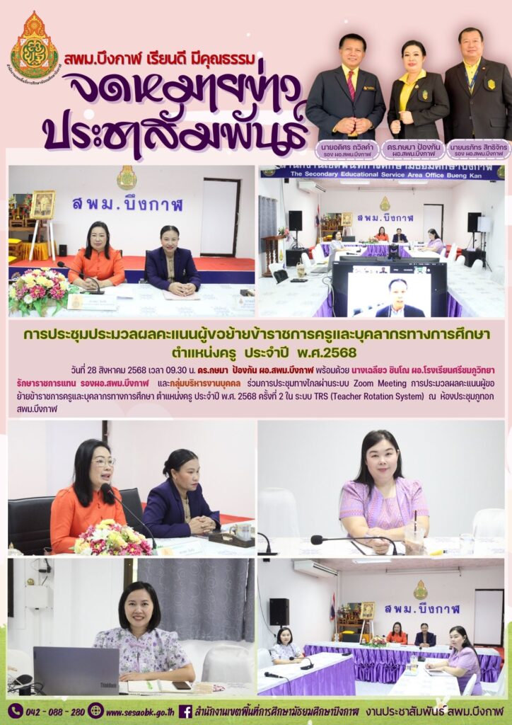 จดหมายข่าว สพม.บึงกาฬการประชุมประมวลผลคะแนนผู้ขอย้ายข้าราชการครูและบุคลากรทางการศึกษา ตำแหน่งครู ประจำปี พ.ศ. 2568 Leave a Comment / จดหมายข่าว สพม.บึงกาฬ / นางสาววริศรา ธรรมลี