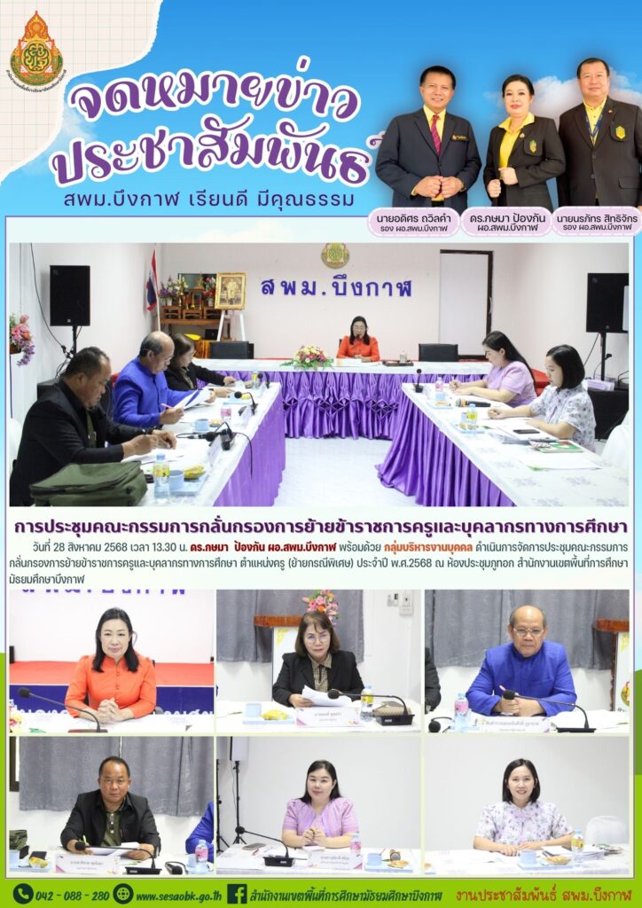 จดหมายข่าว สพม.บึงกาฬการประชุมคณะกรรมการกลั่นกรองการย้ายข้าราชการครูและบุคลากรทางการศึกษา ตำแหน่งครู (ย้ายกรณีพิเศษ) ประจำปี พ.ศ.2568 Leave a Comment / จดหมายข่าว สพม.บึงกาฬ / นางสาววริศรา ธรรมลี