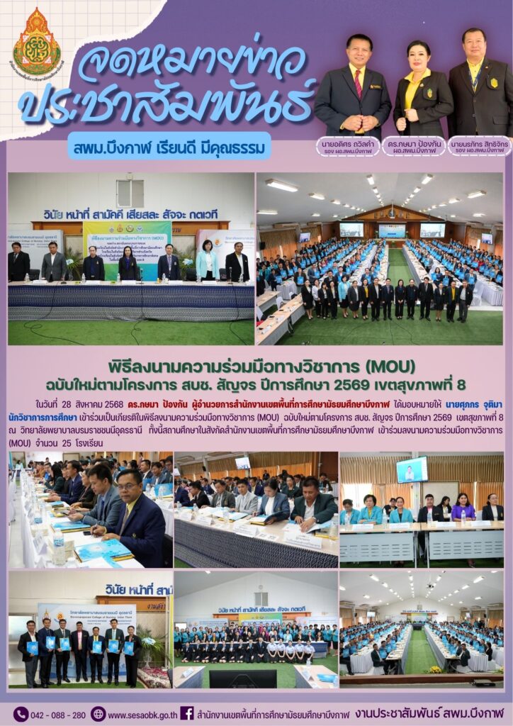 จดหมายข่าว สพม.บึงกาฬพิธีลงนามความร่วมมือทางวิชาการ (MOU) ฉบับใหม่ตามโครงการ สบช. สัญจร ปีการศึกษา 2569 เขตสุขภาพที่ 8 Leave a Comment / จดหมายข่าว สพม.บึงกาฬ / นางสาววริศรา ธรรมลี