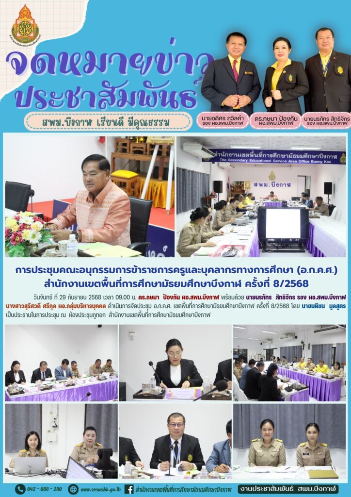 จดหมายข่าว สพม.บึงกาฬการประชุม อ.ก.ค.ศ. เขตพื้นที่การศึกษามัธยมศึกษาบึงกาฬ ครั้งที่ 8/2568 Leave a Comment / จดหมายข่าว สพม.บึงกาฬ / นางสาววริศรา ธรรมลี