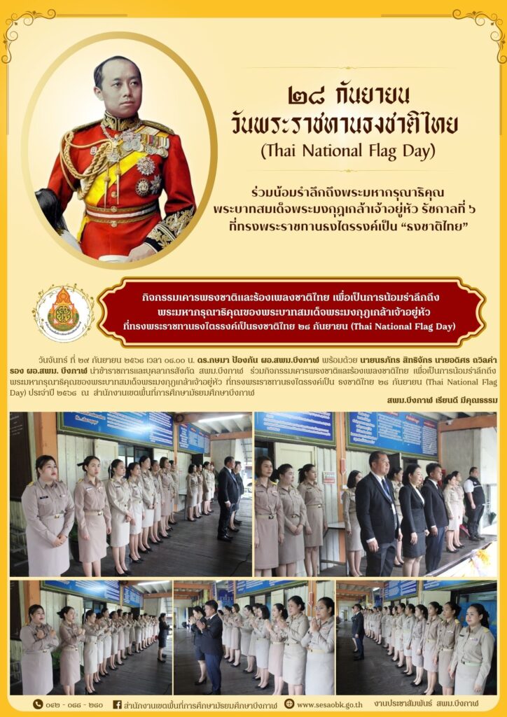 จดหมายข่าว สพม.บึงกาฬกิจกรรมเคารพธงชาติและร้องเพลงชาติไทย เพื่อเป็นการน้อมรำลึกถึงพระมหากรุณาธิคุณของพระบาทสมเด็จพระมงกุฎเกล้าเจ้าอยู่หัว ที่ทรงพระราชทานธงไตรรงค์เป็น “ธงชาติไทย” ๒๘ กันยายน (Thai National Flag Day) ประจำปี ๒๕๖๘ Leave a Comment / จดหมายข่าว สพม.บึงกาฬ / นางสาววริศรา ธรรมลี