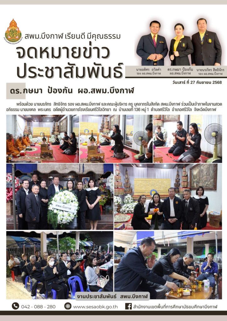 จดหมายข่าว สพม.บึงกาฬร่วมเป็นเจ้าภาพในงานสวดอภิธรรม นายมงคล พระนคร อดีตผู้อำนวยการโรงเรียนศรีวิไลวิทยา Leave a Comment / จดหมายข่าว สพม.บึงกาฬ / นางสาววริศรา ธรรมลี
