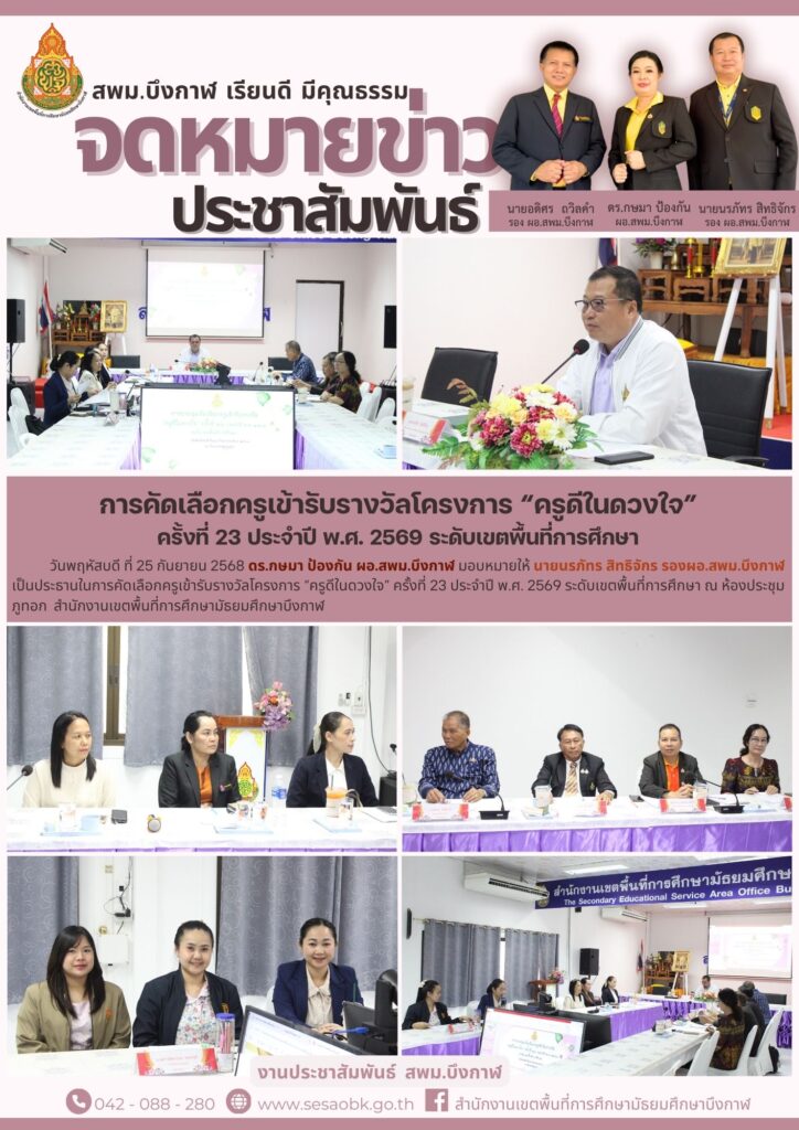 จดหมายข่าว สพม.บึงกาฬการคัดเลือกครูเข้ารับรางวัลโครงการ “ครูดีในดวงใจ” ครั้งที่ 23 ประจำปี พ.ศ. 2569 ระดับเขตพื้นที่การศึกษา Leave a Comment / จดหมายข่าว สพม.บึงกาฬ / นางสาววริศรา ธรรมลี